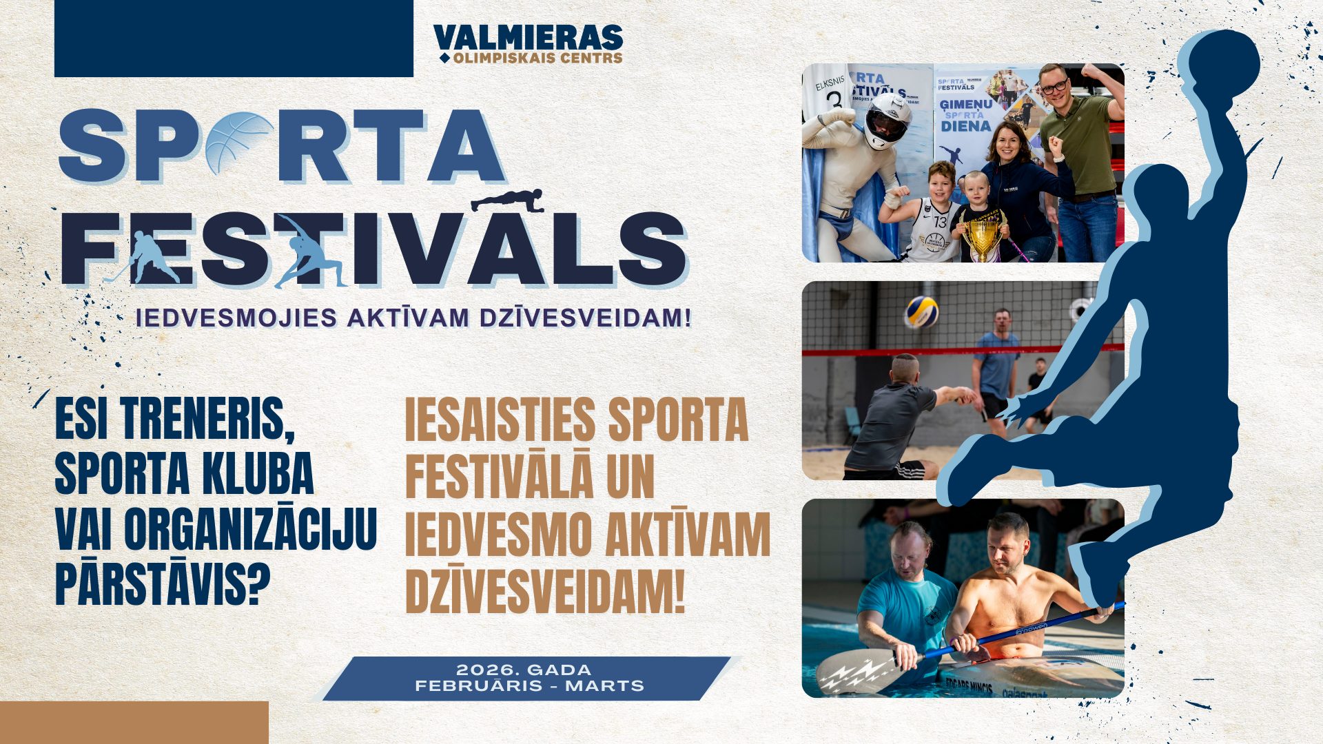 2026. gada februārī un martā norisināsies jau trešais Valmieras Olimpiskā centra SPORTA FESTIVĀLS – pasākums, kas pulcē aktīva dzīvesveida entuziastus un sniedz iespēju iepazīt sporta un kustības daudzveidību.