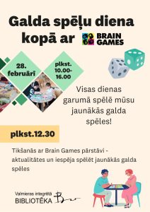 28. februārī Valmieras Integrētās bibliotēkas otrajā stāvā no plkst.10.00 līdz 16.00 lieliem un maziem būs iespēja spēlēt dažādas galda spēles. Savukārt plkst.12.30 tikšanās ar Brain Games pārstāvi. Būs iespēja uzzināt par jaunākajām galda spēļu aktualitātēm, izmēģināt tās un piedalīties citās aizraujošās aktivitātēs. Gaidāms arī konkurss tiem, kuri Galda spēļu dienu apmeklēs klātienē.