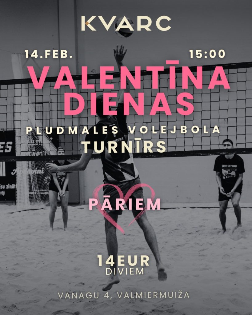 Aicina pārus pieteikties Valentīna dienas pludmales volejbola turnīram! 14. februārī plkst. 15.00 iekštelpu pludmales volejbola hallē “Kvarc” notiks Mix pāru turnīrs.