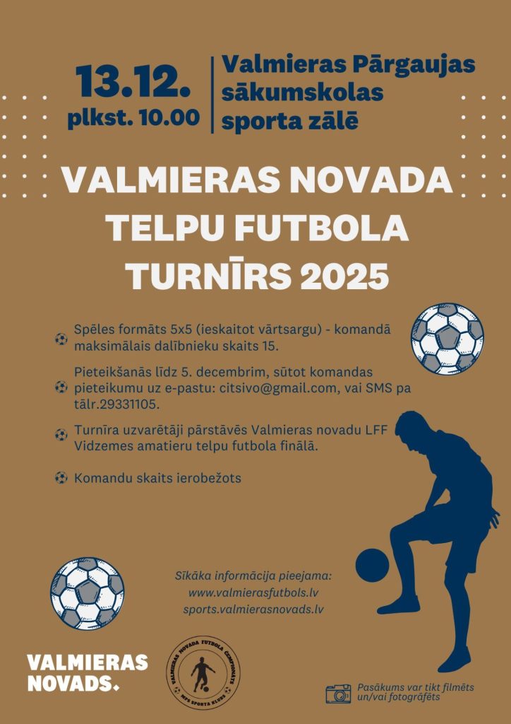 13. decembrī plkst. 10.00 Valmieras Pārgaujas sākumskolas sporta zālē notiks Valmieras telpu futbola čempionātā 2025./2026. Turnīrs pulcēs komandas no Valmieras un apkārtējiem novadiem, sniedzot iespēju futbola entuziastiem aizvadīt dinamiskas sacensības ziemas sezonā.