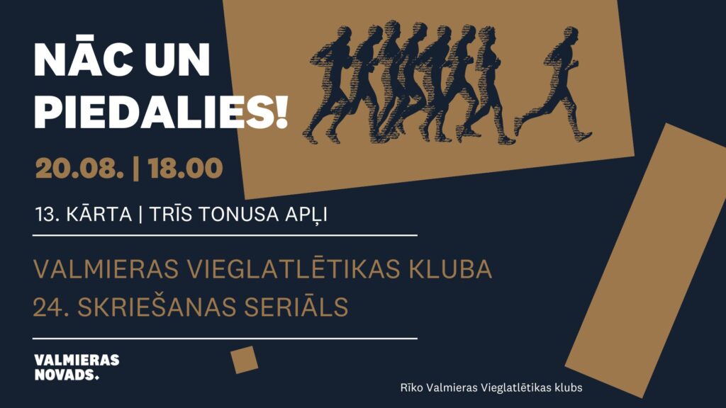 No 19. marta līdz 8. oktobrim, trešdienu vakaros aicinām piedalīties Valmieras Vieglatlētikas kluba rīkotajā skriešanas seriālā. Skrējieni notiks Jāņa Daliņa stadionā vai pa marķētu trasi stadiona apkārtnē. Seriāls tiek rīkots ar mēķi popularizēt skriešanu un aktīvu dzīvesveidu, tāpēc ikviens interesents ir aicināts piedalīties, izaicinot sevi, draugus un ģimeni sacensību gaisotnē. Izvēloties sev vēlamo distanci vai skriešanas ilgumu, dalībnieki aicināti piedalīties dažādos posmos. Aktīvākie skrējēji, kuri būs startējuši vismaz 9 posmos tiks apbalvoti.